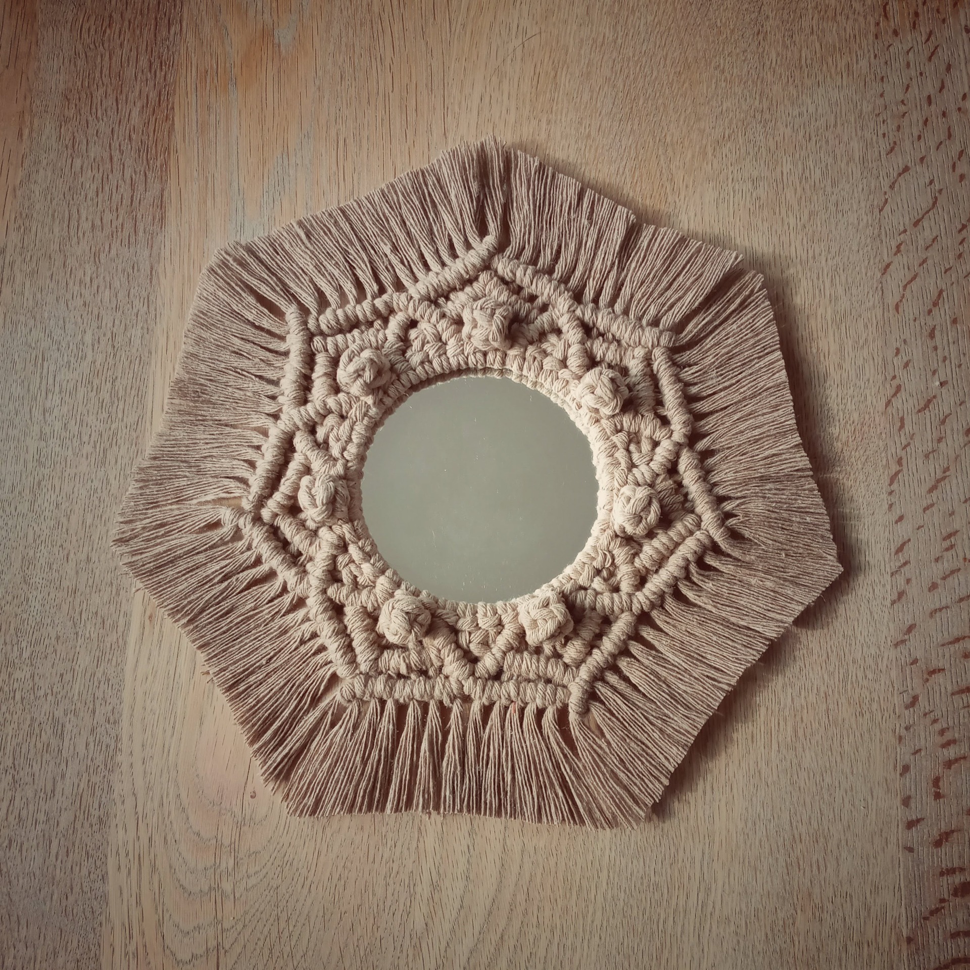 Je kan kiezen tussen spiegels van 10 cm, 20 cm en 34 cm diameter. Daarrond wordt dan een macramérand geknoopt.
